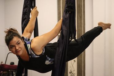 Aerial yoga or Trapeze yoga is just like any other form of yoga but utilises a hammock/trapeze or yoga swing (suspended from the ceiling) to allow you to perform a diverse range of poses you can’t normally do on a traditional yoga mat.